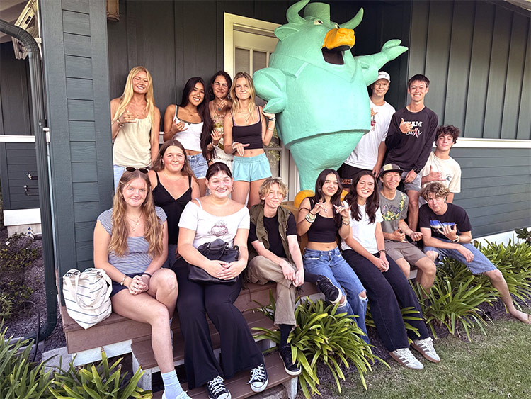 One of our longest-standing traditions is the mysterious “stealing of the Bull” where the senior class sneaks our beloved mascot off campus to transform it into their own. The tradition begins each year with a secret summer steal, followed by many coats of paint to turn it into a new character, then a big reveal at our annual Fall BBQ, and ends with the Bull settling into Kahilu Hall, where it joins the lineup of every class’s creation before it.