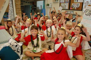 All 104 students in kindergarten through grade 5 worked twice a week for four months under the direction of kumu hula (dance teacher) Liana Aveiro to learn Hawaiian language, oli (Hawaiian chants), mele (Hawaiian song) and hula (Hawaiian form of dance). Also, more than 15 faculty, staff, plus middle and upper school students danced the hula.